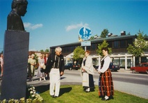 Sukukokouksessa 1992 laskettiin kukkalaite sukuun kuuluvan säveltäjä Toivo Kuulan patsaalle. Kuva paikallislehti Viiskunta.