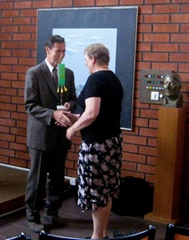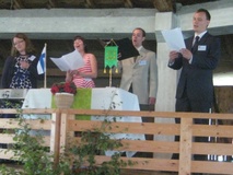 2011 muistettiin myös sukuviirillä, kättelemässä Jussi Haapa-aho ja Kaarina Rintamäki, vieressä pronssiin valettuna sukuun kuuluva kansanlaulaja Tiila Ilkka.